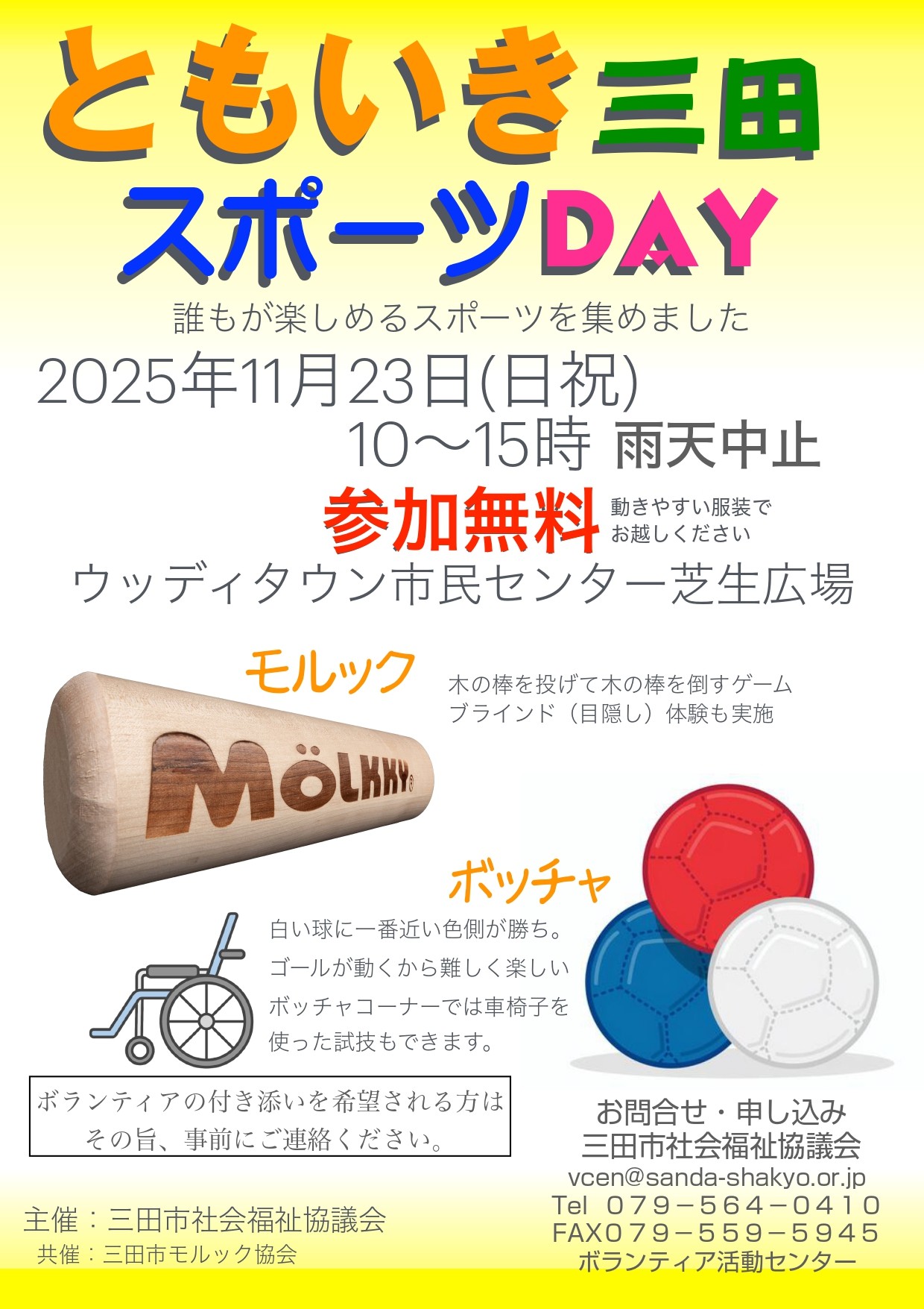 11月23日(日・祝)10:00~15:00にウッディタウン市民センター芝生広場にて誰もが楽しめるスポーツイベントを企画いたしました。三田市社会福祉協議会が主催、三田市モルック協会の共催で、ボッチャ、モルックなど複数のスポーツを障害の有無に関係なく誰もが楽しめるスポーツを体験できます。申し込みは不要ですので、当日お気軽に直接お越しください。