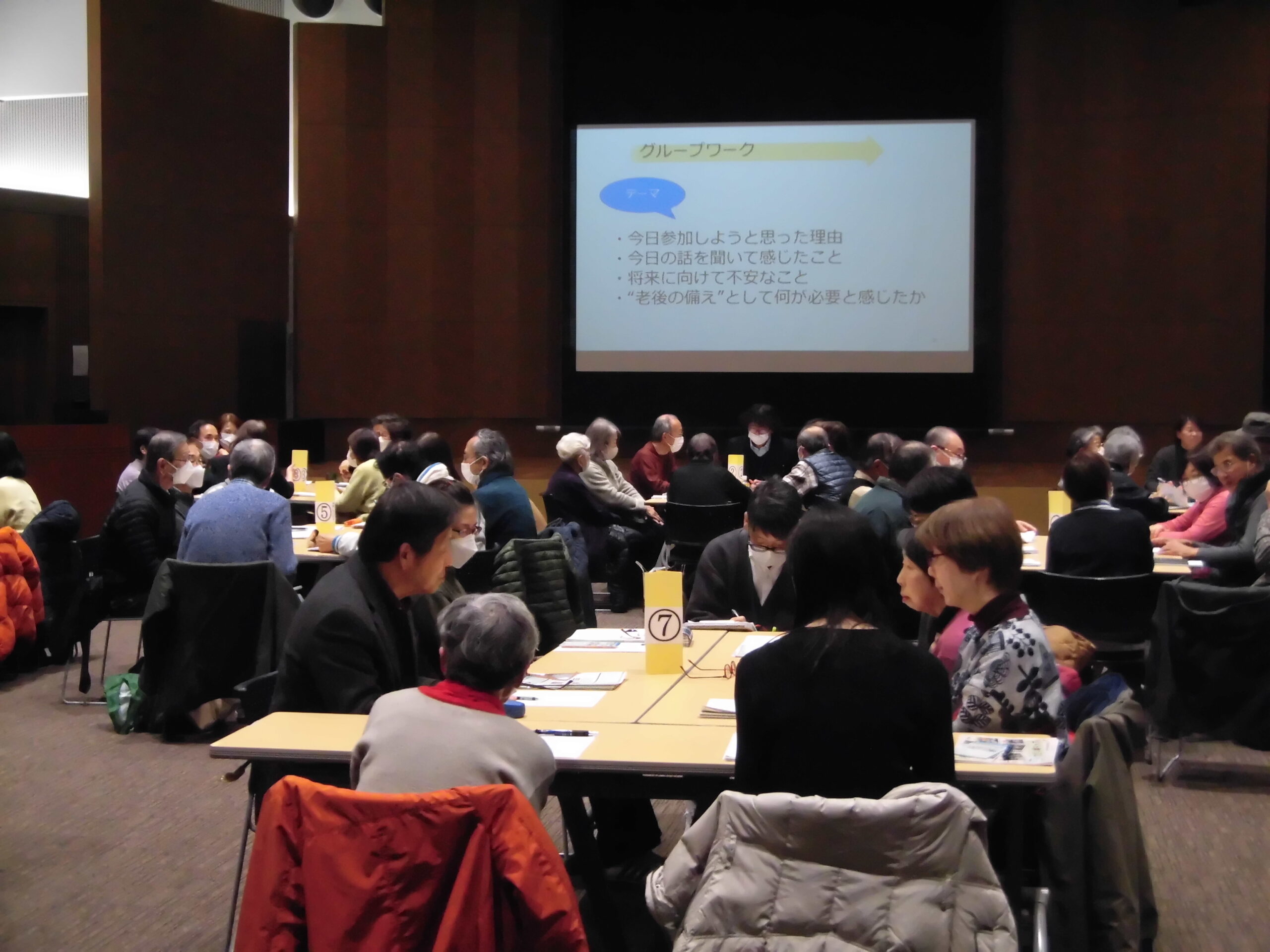 また、「きょうの話を聞いて感じたこと」や「将来に向けて不安なこと」「老後の備えとして何が必要と感じたか」などをテーマにグループで話し合っていただきました。